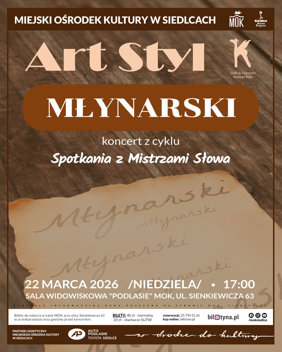 22 marca 2026 r. (niedziela) godz.17.00 zapraszamy na Koncert Zespołu Wokalnego Art Styl Spotkania z Mistrzami Słowa. Koncert II: MŁYNARSKI